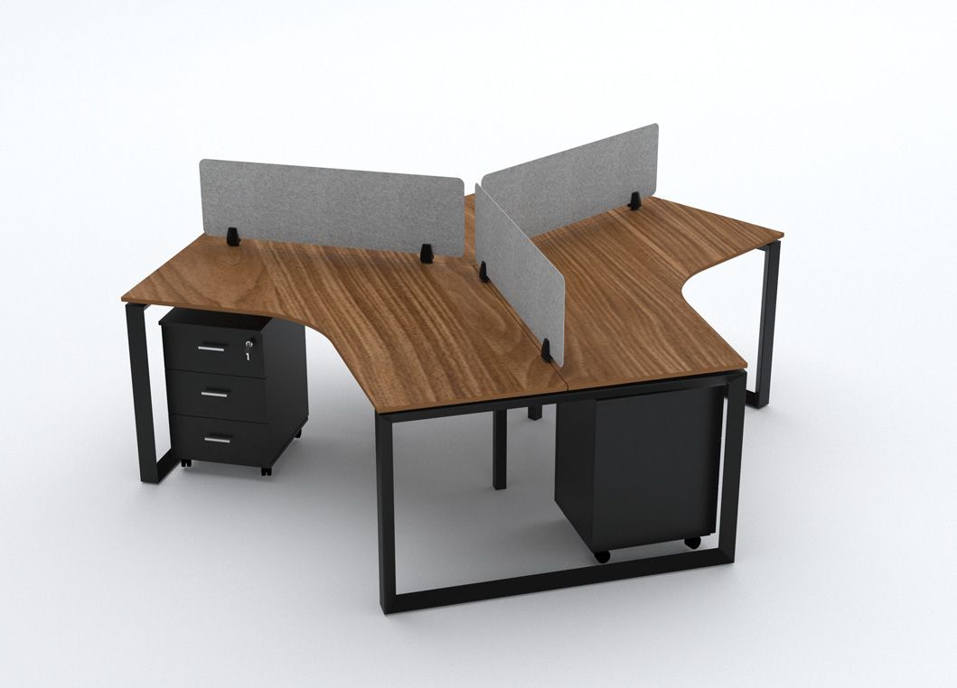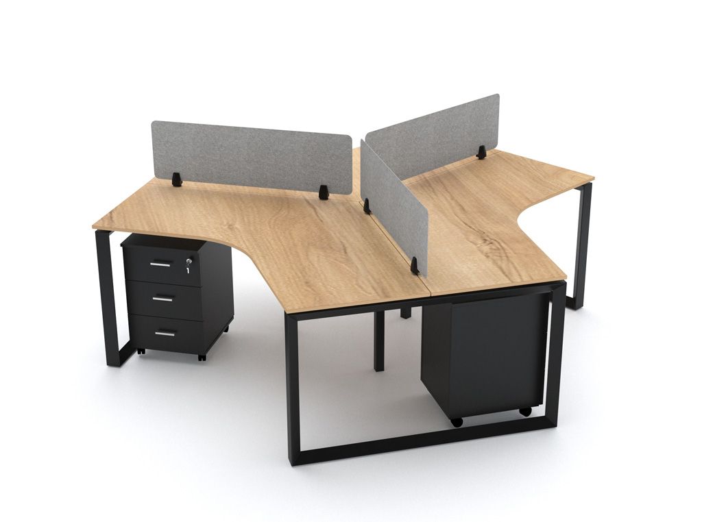 DIAMOND Workstation Cluster of 3 Face to Face features in a triangular modern minimalistic design with eco-friendly components. This office furniture piece offers 3 workspaces by allowing individuals to seat facing the center point. By layout, it uniquely forms the Y-shape which stylishly occupies open collaborative workplaces. On the top, we make it with a textured wooden worktop and straight edge profile together with a privacy panel. While it offers a massive collaborative workspace it also comes with a partial privacy panel to decide on 3 personalized work areas. At the base, DIAMOND workstation desks stand steadily with either white or black coated steel frames and legs. This noncorrosive coating allows it to perform durable with little to no wear for relative more year to come in high traffic employee workplaces. What make Desk Craft workstation desk clusters the most functional is having round grommets and mobile storage section.