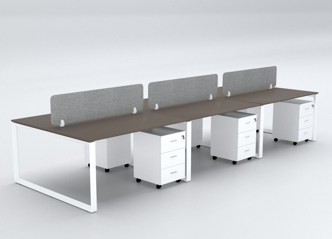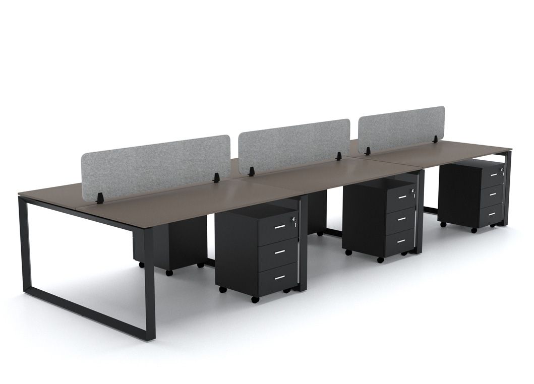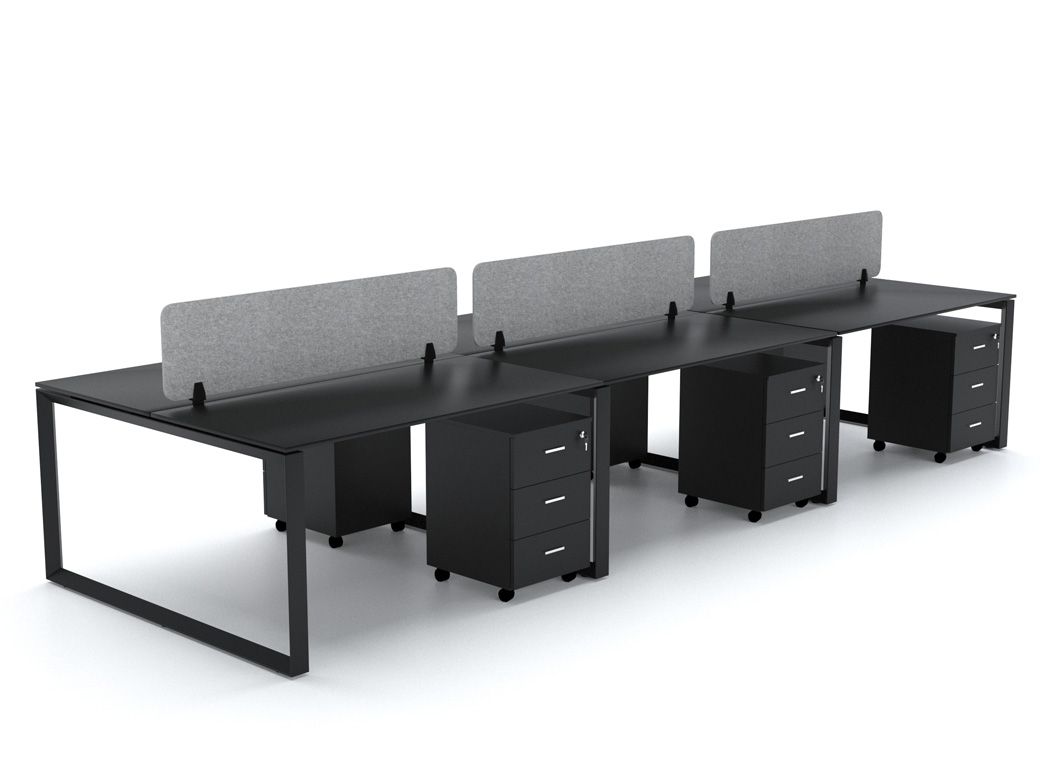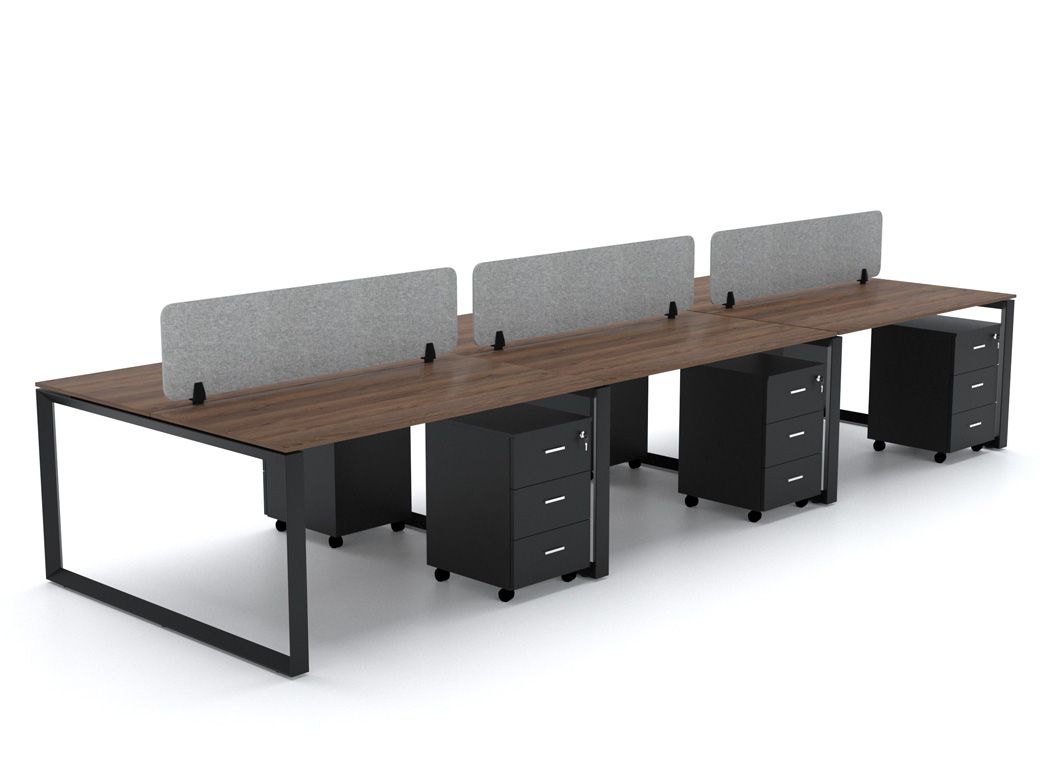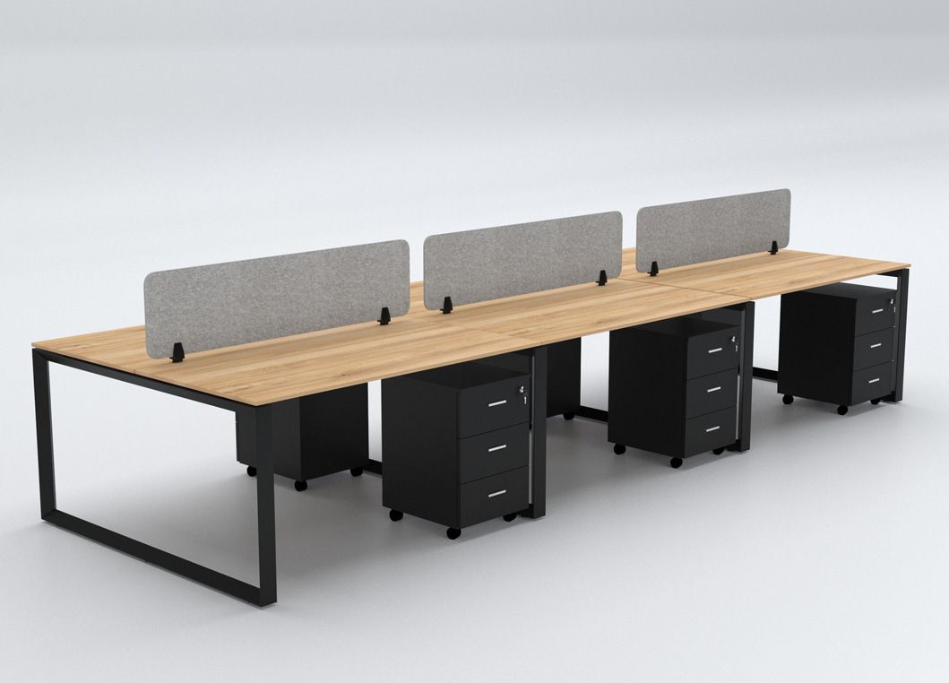 Diamond Workstation Cluster of 6 Face to Face features in a rectangular modern minimalistic design with eco-friendly components. This office furniture piece offers 6 workspaces strategically placed in a functional face-to-face layout. While 3 individuals seat in a side-by-side format, they also face the other set of 3 yet separated with a mid panel. On the top, we make it with a textured wooden worktop and straight edge profile for same hand placement. While it offers a massive collaborative workspace it also comes with a partial privacy panel to define personalized work areas. At the base, Diamond workstation desks stand steadily with either white or black coated steel frames and legs. This noncorrosive coating allows it to perform durable with little to no wear for relative more year to come in high traffic employee workplaces. What make Desk Craft workstation desk clusters the most functional in Dubai, is having round grommets and mobile storage section.